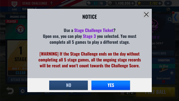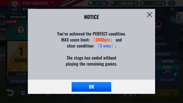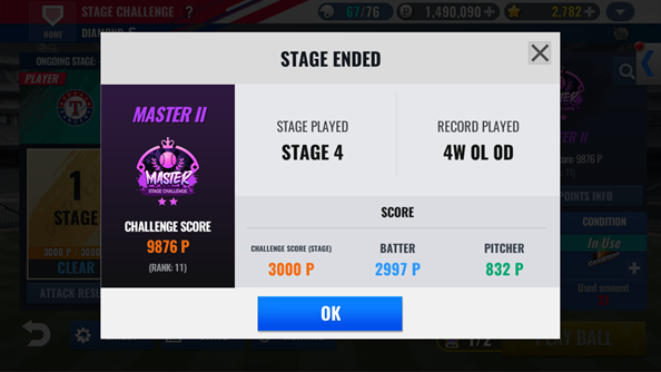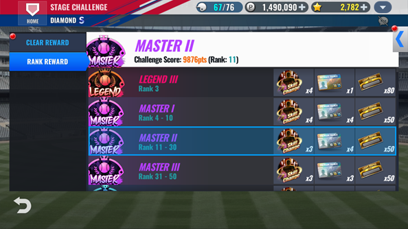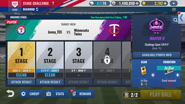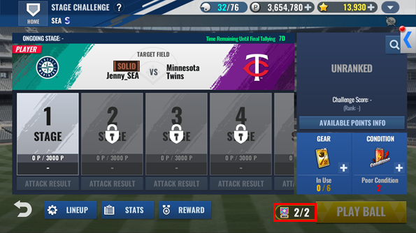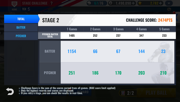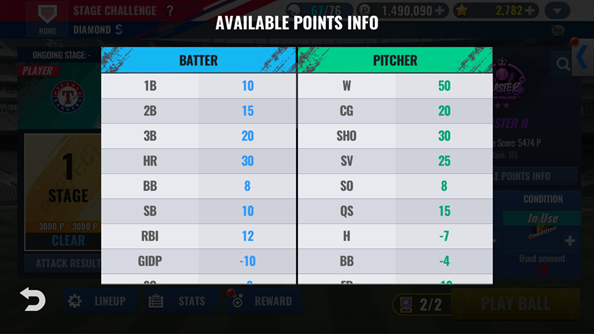 - You can check how many points can be earned based on the pitcher/batter record by tapping Available Points Info on the main menu of Stage Challenge.