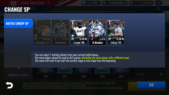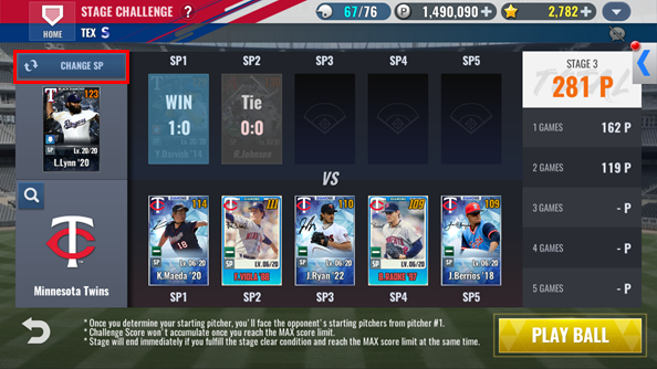 If a starting pitcher is not set, starting pitchers #1-5 from your batlte lineup take the mound in order. The same player can only be used once per stage.